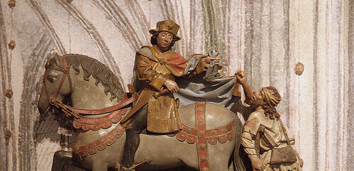 Maar hij is het meest bekend door zijn daad van barmhartigheid toen hij als Romeins militair, op een koude dag, bij de stadspoort van Amiens zijn rode soldatenmantel deelde met een arme naakte bedelaar. In een droom nadien, zag hij dat hij zijn halve mantel met Jezus had gedeeld. Hij verliet toen het leger, liet zich dopen en werd kluizenaar in Ligugé bij Poitiers. Later werd hij bisschop van Tours en overleed op een van zijn reizen in 397 in Candes.