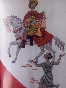Amiens zijn mantel doorsnijdt en de helft ervan aan een bedelaar geeft.